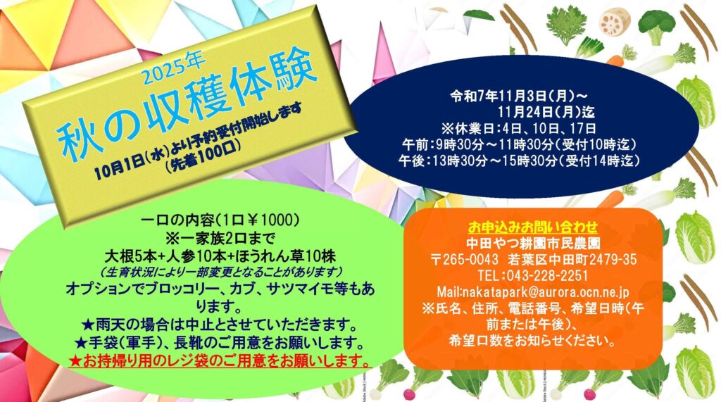 若葉区中田町の中田やつ耕園市民農園では、11月3日(月)~11月24日(月)まで、秋の収穫体験を実施します。大根、にんじん、ほうれんそうなどの秋野菜の収穫が体験できます。予約は10月1日(水)スタート、先着100口まで。