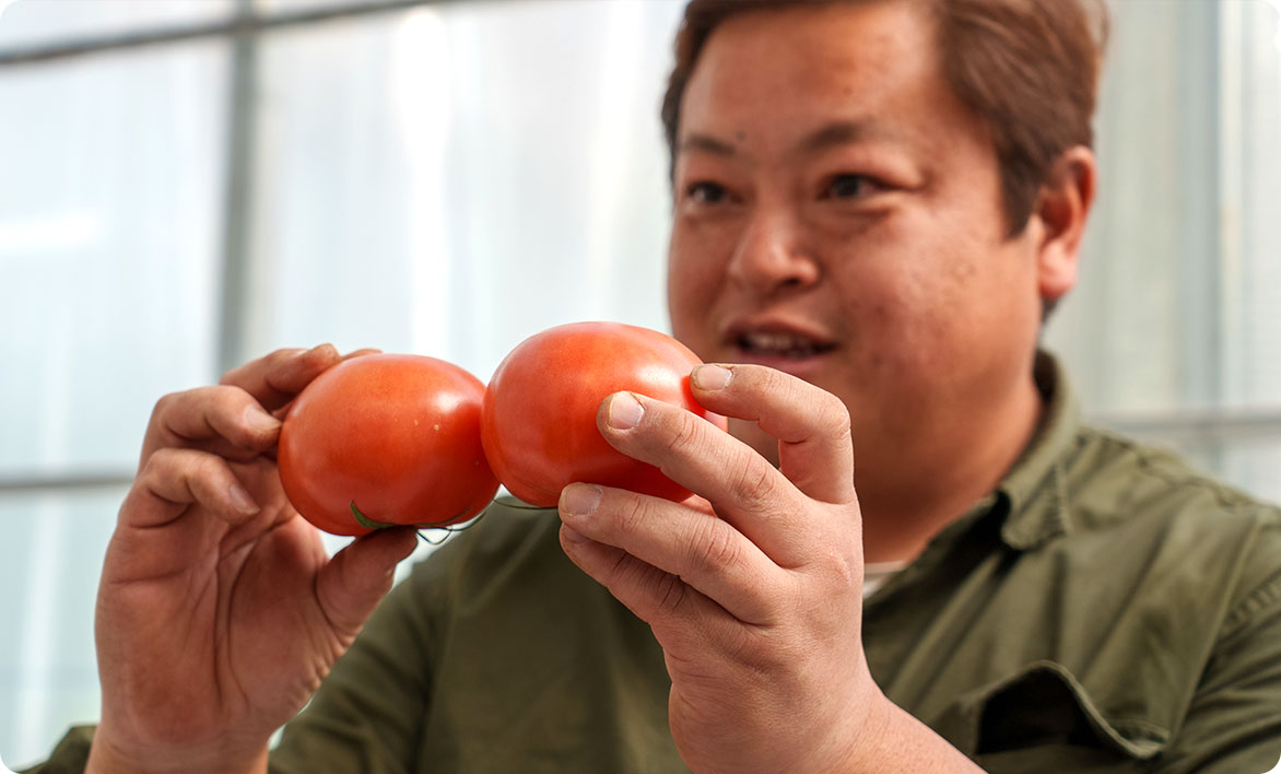 「食卓に毎日出してもらえるトマト」を目標としており、甘いだけでなく、昔ながらの青臭さもあるトマトづくりのためにイノチオアグリ株式会社さんや農政センター等、外部の力も取り入れて日々研究をされています。